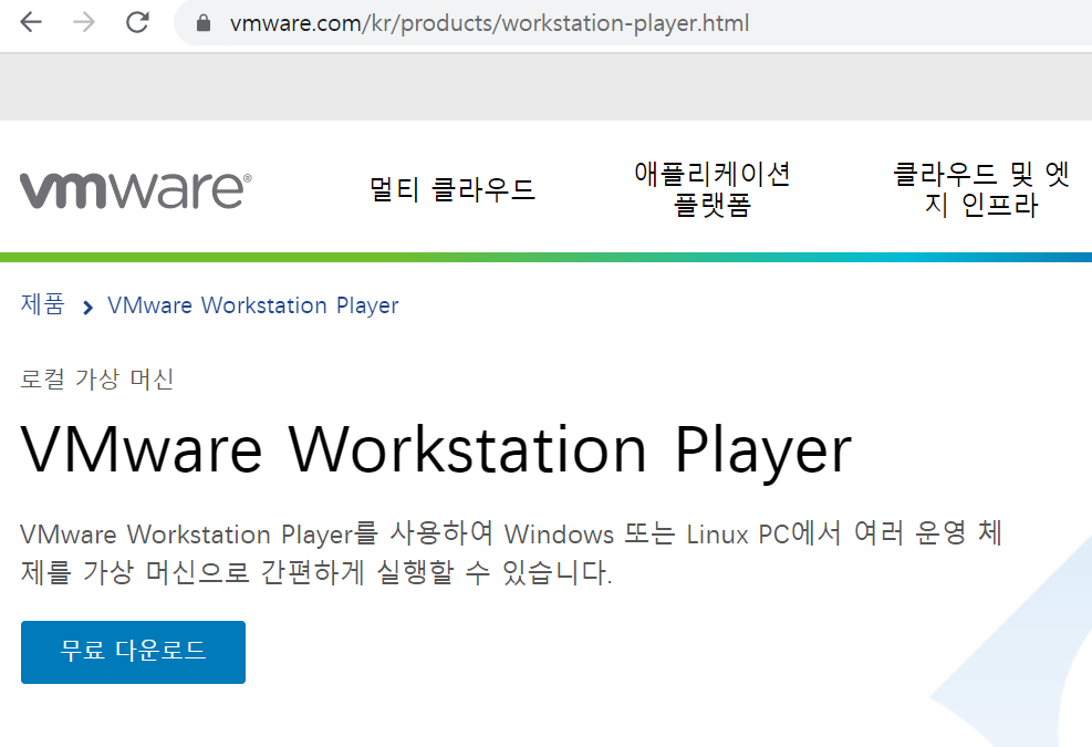 1. https://www.vmware.com/kr/products/workstation-player.html 진입하여 무료다운로드 버튼 클릭