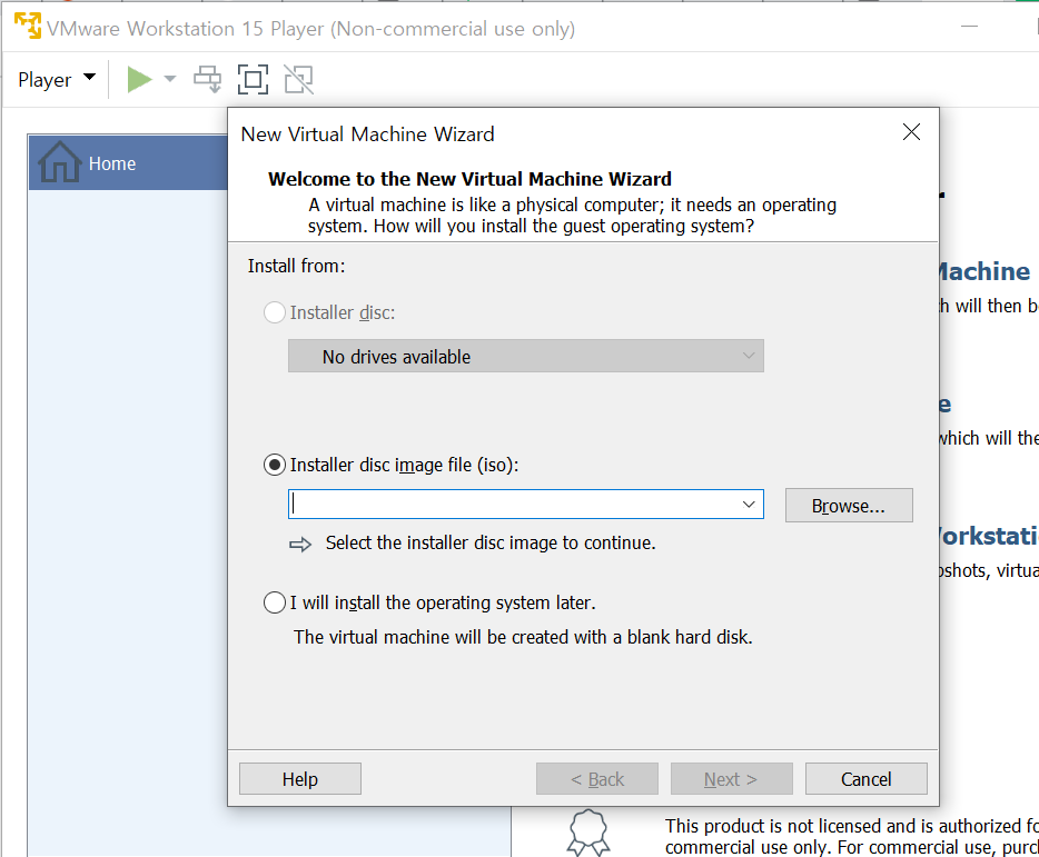 위 글에서 윈도우에 무료 가상머신인 vmware workstation player 설치까지 진행완료했다.