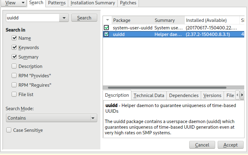 15. yast proxy 에서 enable proxy 체크해제하고 yast online update메뉴 진입하여 uuidd 검색하고 accept , libuuidd1 검색하고 accept, unrar 검색하고 accept, libaio1 검색하고 accpet